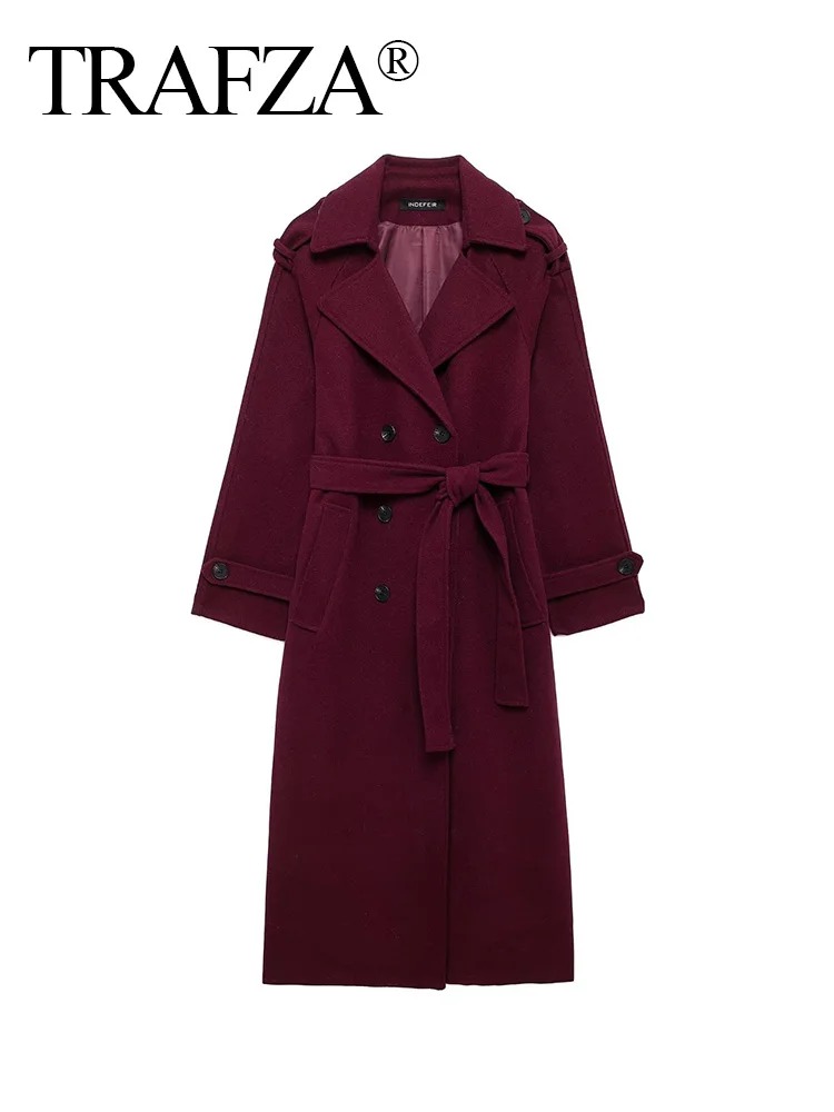 معطف ماكسي عنابي للنساء من HH، شتوي وأنيق، مزدوج الصدر مع حزام على الخصر يبرز القوام. مناسب لكل يوم أو مناسبات، يعطيك دفء وفخامة بنفس الوقت.